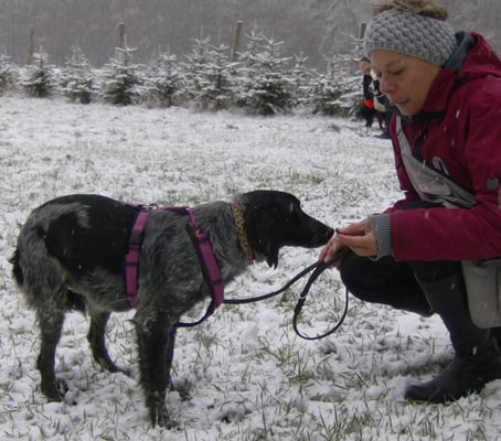 Es war sehr kalt und hat intensiv geschneit. Nayeli war angespannt, hat sich weggeduckt und ihre Rute stark eingeklemmt. Ein bisschen ab vom Getümmel konnte sie sich im Wald lösen. Ich habe sie ins Auto in die Box gebracht. Auf der Rückreise war von ihr über die ganzen 5 Stunden kein Ton zu hören. Beim Zwischenhalt wollte sie nicht aus der Box kommen, ich musste sie heraus heben. Pieseln ging aber nicht. Auch am Abend zu Hause im Garten nicht...